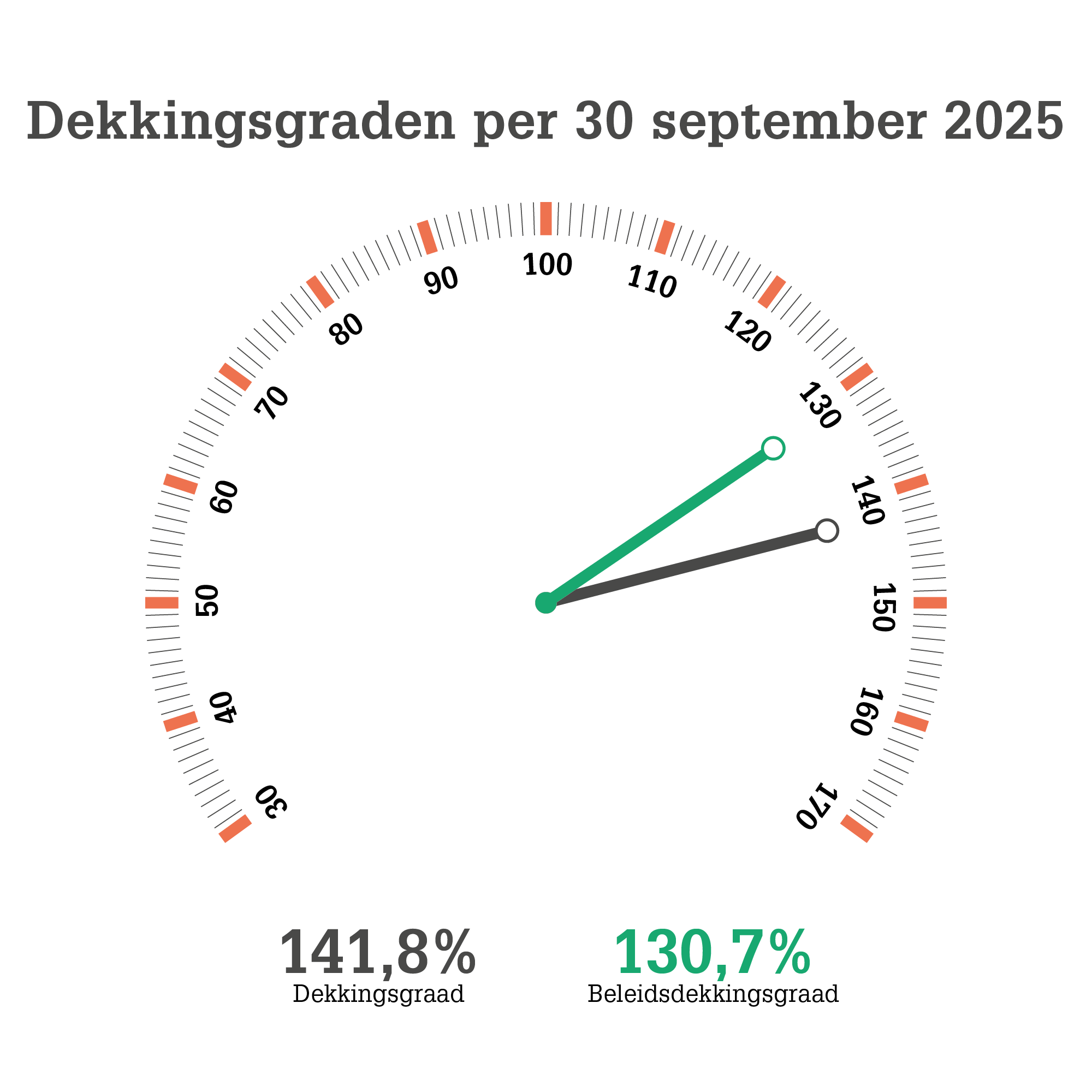 De dekkingsgraad geeft aan of ons fonds op de peildatum voldoende geld heeft om de opgebouwde pensioenen nu en in de toekomst te betalen. Hoe hoger de dekkingsgraad, hoe beter ons fonds er financieel voor staat. Bij een dekkingsgraad van 100% is er op de peildatum genoeg geld in kas om de opgebouwde pensioenen uit te keren. De dekkingsgraad per 30 september 2025 is berekend op 141,8%. Dit betekent dat de dekkingsgraad met 1,8 procentpunten is gestegen ten opzichte van augustus 2025.